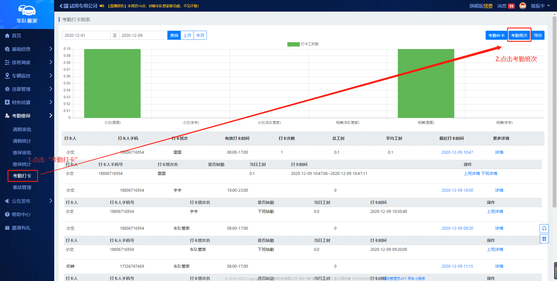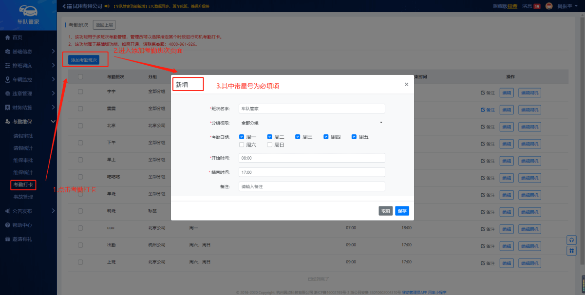 管理员在添加完考勤打卡后添加需要打卡的司机,同时后台支持同个司机打卡多个班次,实现司机早晚班打卡。