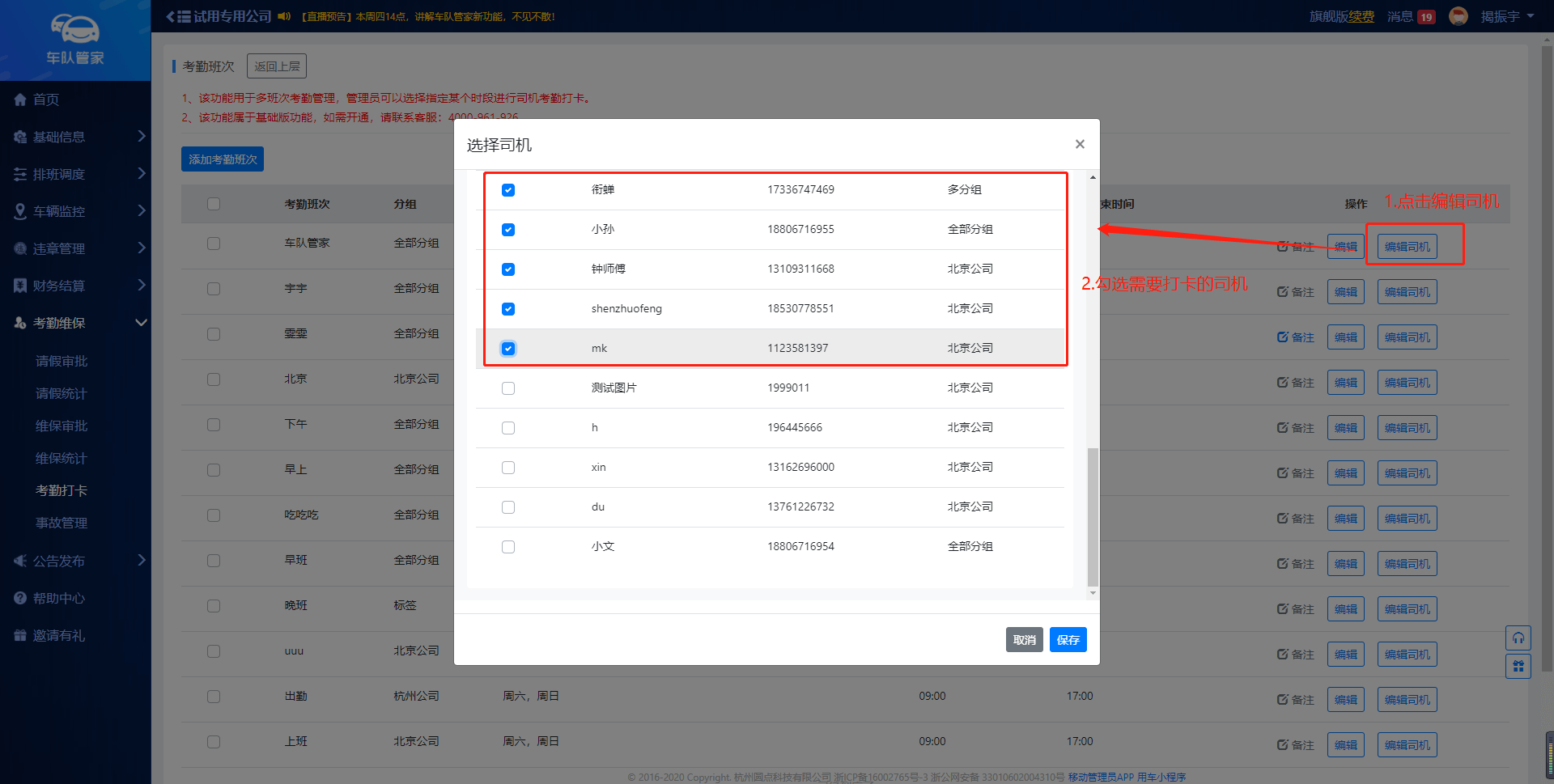 第二步:勾选打卡司机