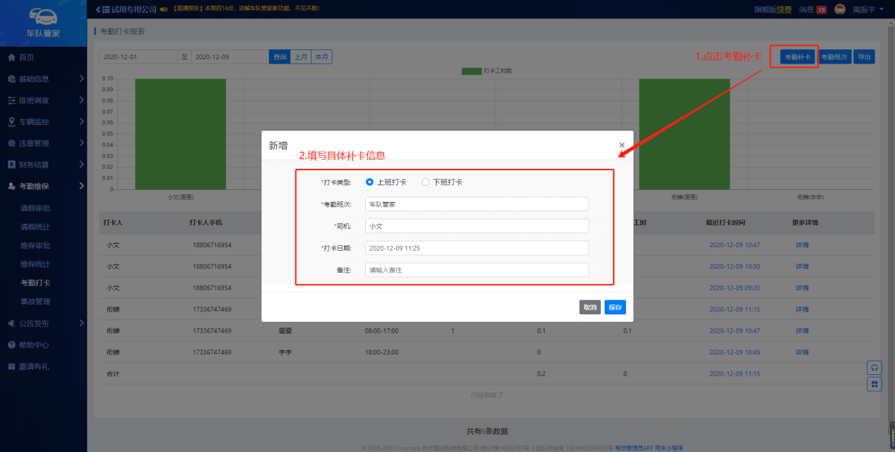 若司机没有按时打卡的情况下,管理员可通过后台重新添加考勤打卡,点击右上角“考勤补卡”,确认打卡类型,其中带星号的为必填项。