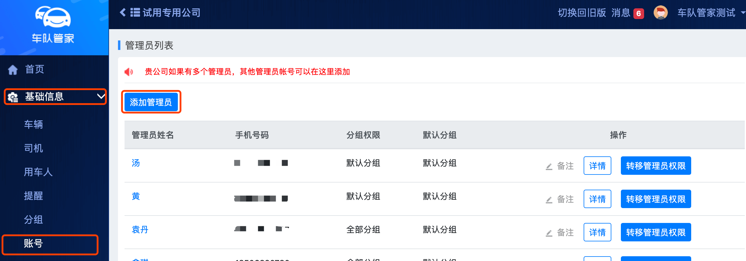 1) 其他管理员账号由注册主账号在网页端“基础信息-账号-添加管理员”进行添加,无需注册。如需修改或删除其他管理员账号,点击“详情-编辑”即可。