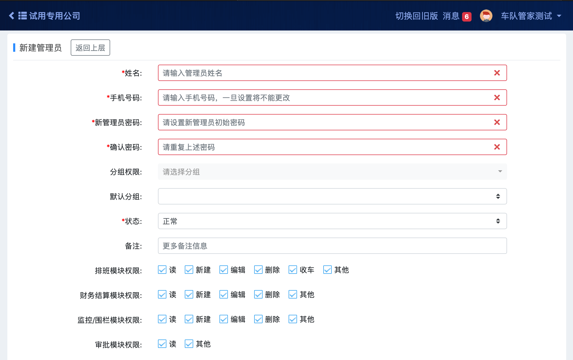 2) 车队管家管理员账号数量添加无限制,并可按不同角色(如调度员、财务等)给予不同权限配置,各权限各尽其责,互不干扰。