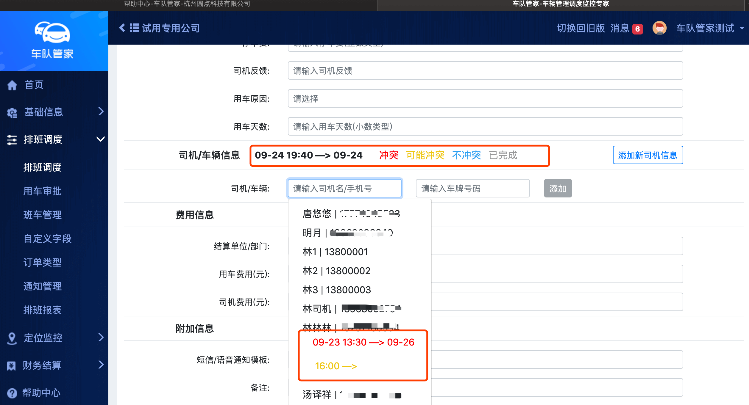2)当您选择司机/车辆的时候,车队管家为您展示所有司机/车辆当天任务时间及类型,非常清晰直观,这个时候您只要选择无冲突的司机/车辆即可。(注:红色表示冲突 黄色表示可能冲突 蓝色表示不冲突 灰色表示已完成,手机端网页端均可操作)如图: