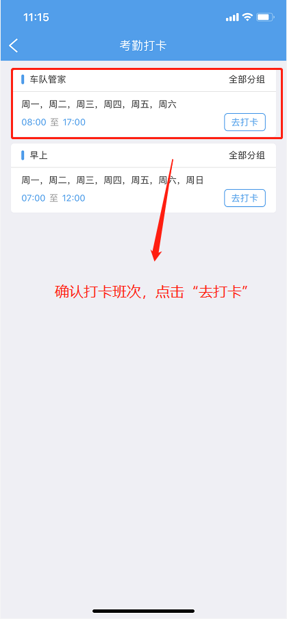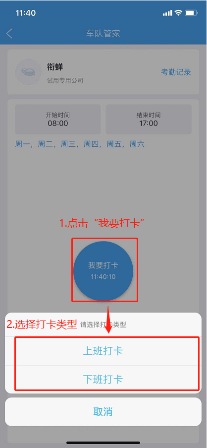 管理员设置完考勤班次后,司机登录司机APP,点击右下角“我的”,点击“考勤打卡”,选择需要打卡的班次,点击“去打卡”。其中需要注意的是上班打卡仅支持一次打卡,下班打卡支持无限次打卡,实时更新下班时间。