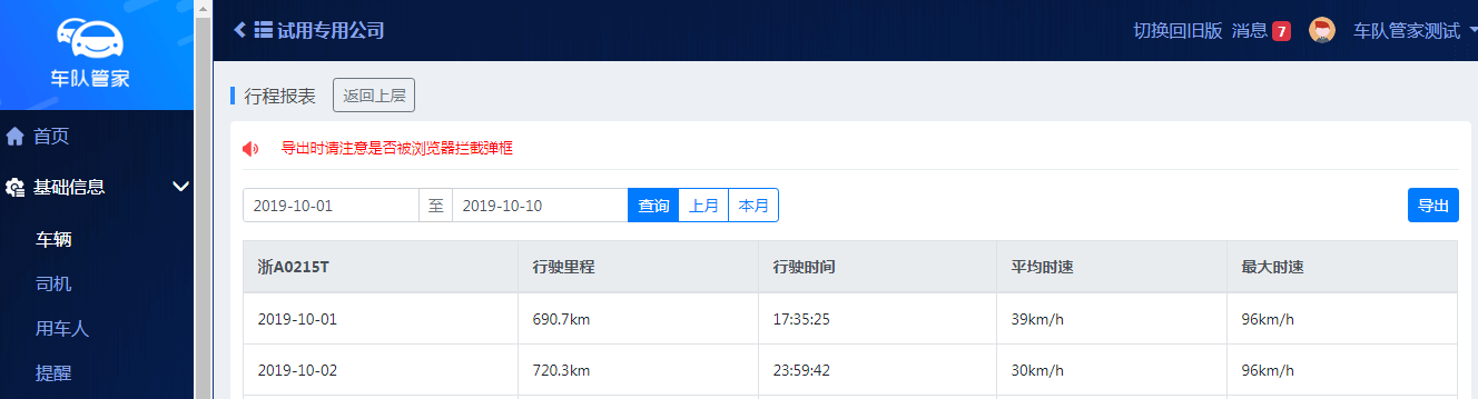 单车每天行程报表,路径:基础信息-车辆-行程报表,可统计该车每天的行驶里程、时间、速度等。支持数据导出。