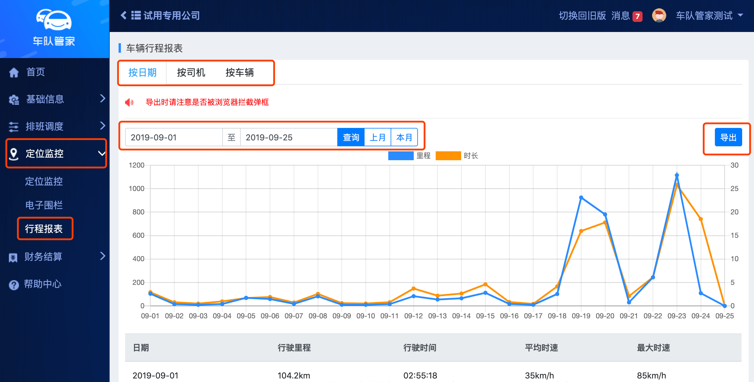 可以。点击定位监控—车辆行程报表,可按日期,按司机,按车辆查看行驶数据。统计数据支持导出。如图: