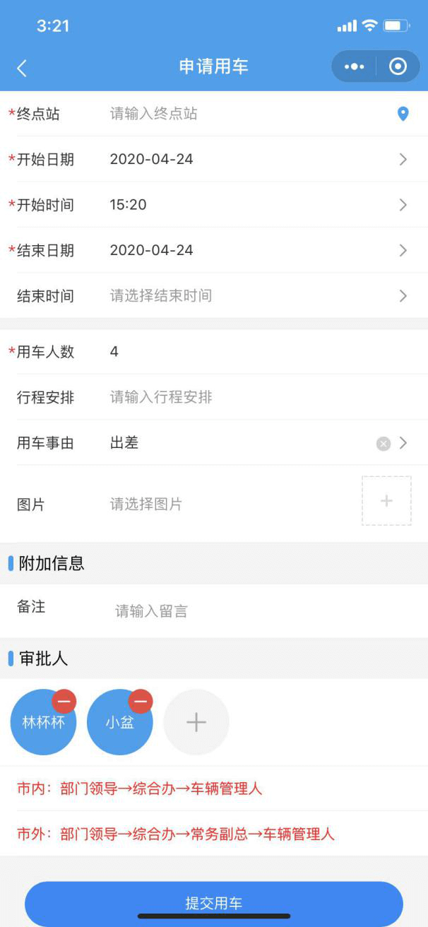 5)审批流程根据实际情况选择相应的审批人,可添加多级审批,确认信息无误后,点击”提交用车“