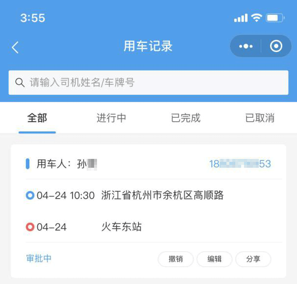 6)如需查询您的用车申请进度,可在首页中点击”用车记录“按钮,审批内容可重新撤销/编辑,如图: