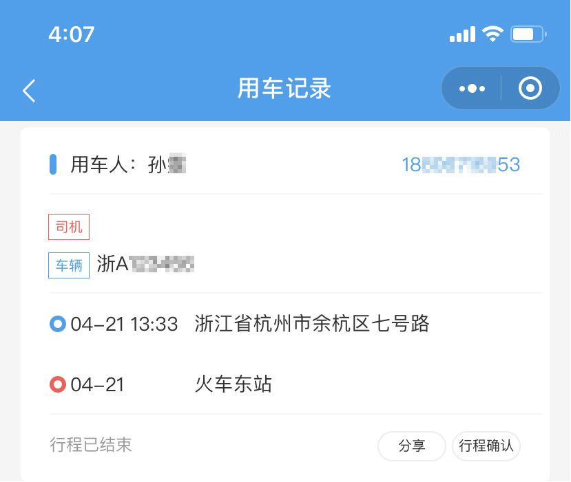 8)行程结束的订单,点击“行程确认”,并添加用车评论,最后可将行程分享给好友