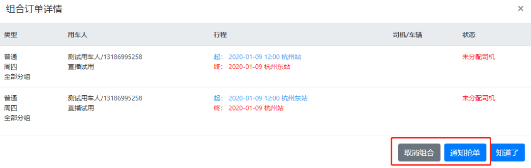 注意:待组合订单必须是未分配司机和车辆,待抢单的订单,且订单数须为2个及以上。