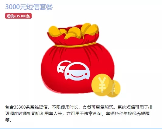 体验包内含100条系统短信服务,可用于排班调度时通知司机和用车人等,亦可用于违章查询、车辆各种年检保养提醒等。