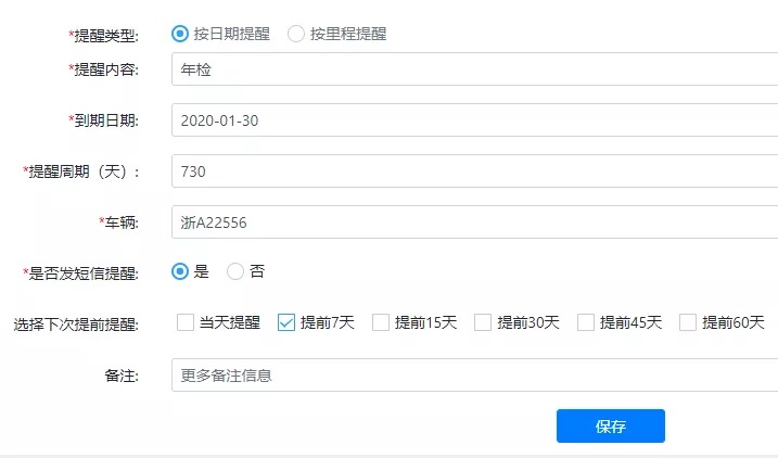 “按日期提醒”的类型,增加“提前提醒”功能,可以选择提前7、15、30、45、60天提醒。