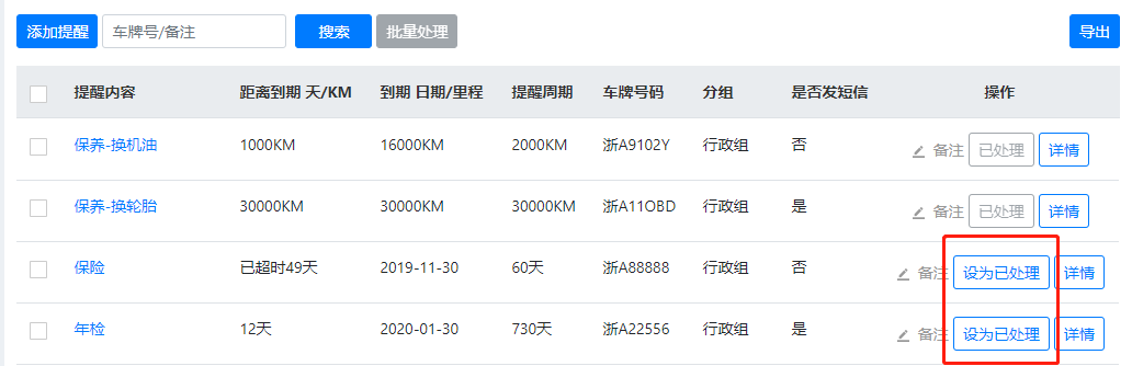 管理员每次收到提醒,并处理相关事宜后,点击“设为已处理”,系统会自动进入下一个日期/里程周期。一次设置,一劳永逸。