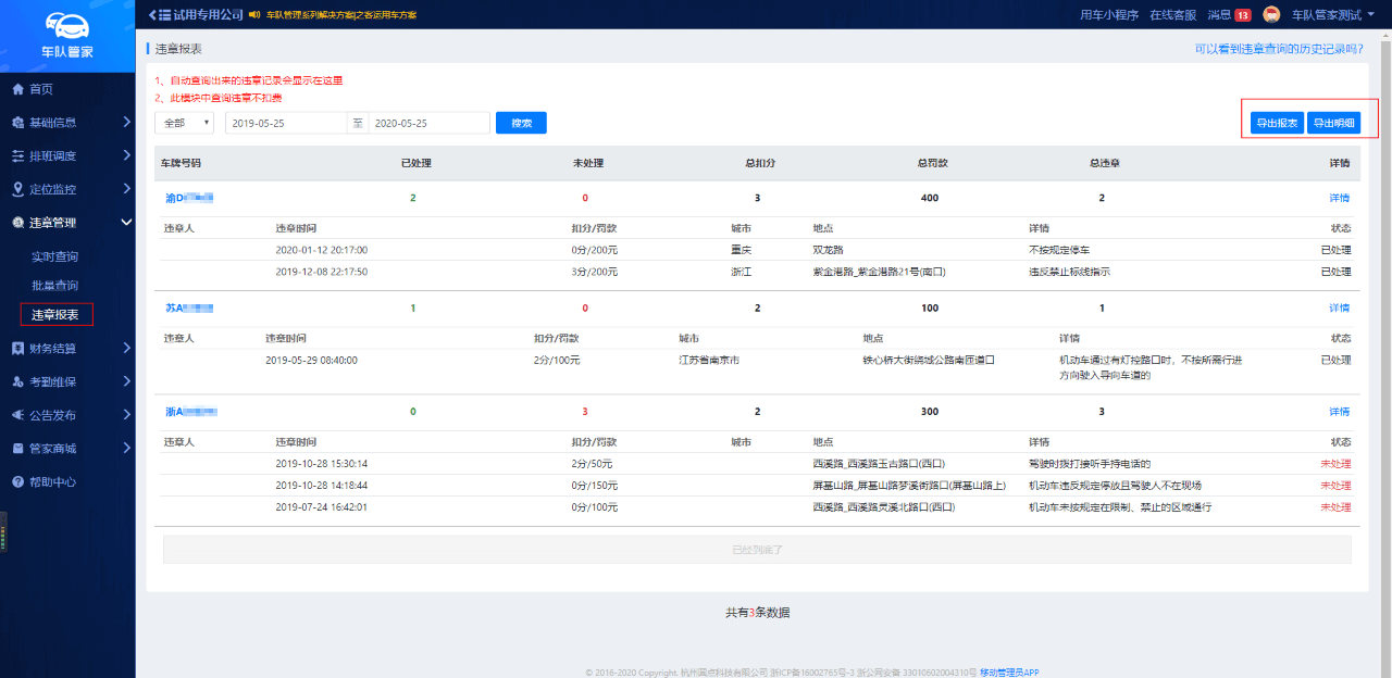 场景:系统可批量查询违章,同时支持违章报表及明细的导出,大幅降低违章管理时间成本。 路径:管理员网页端--违章管理--违章报表--导出报表/导出明细