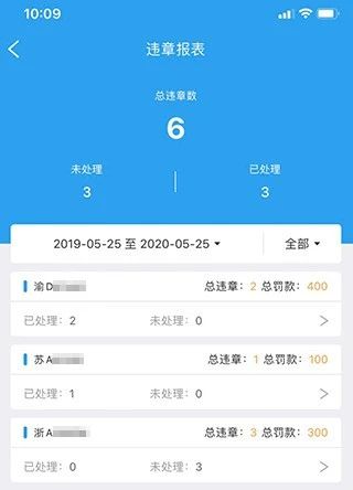 管理员APP端也可进行违章查询,查看违章总数、罚款金额。