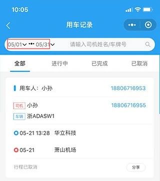 场景:用车人利用后台系统将自动筛选出日期范围内的行程记录。 路径:用车小程序--用车记录--左上角日期范围