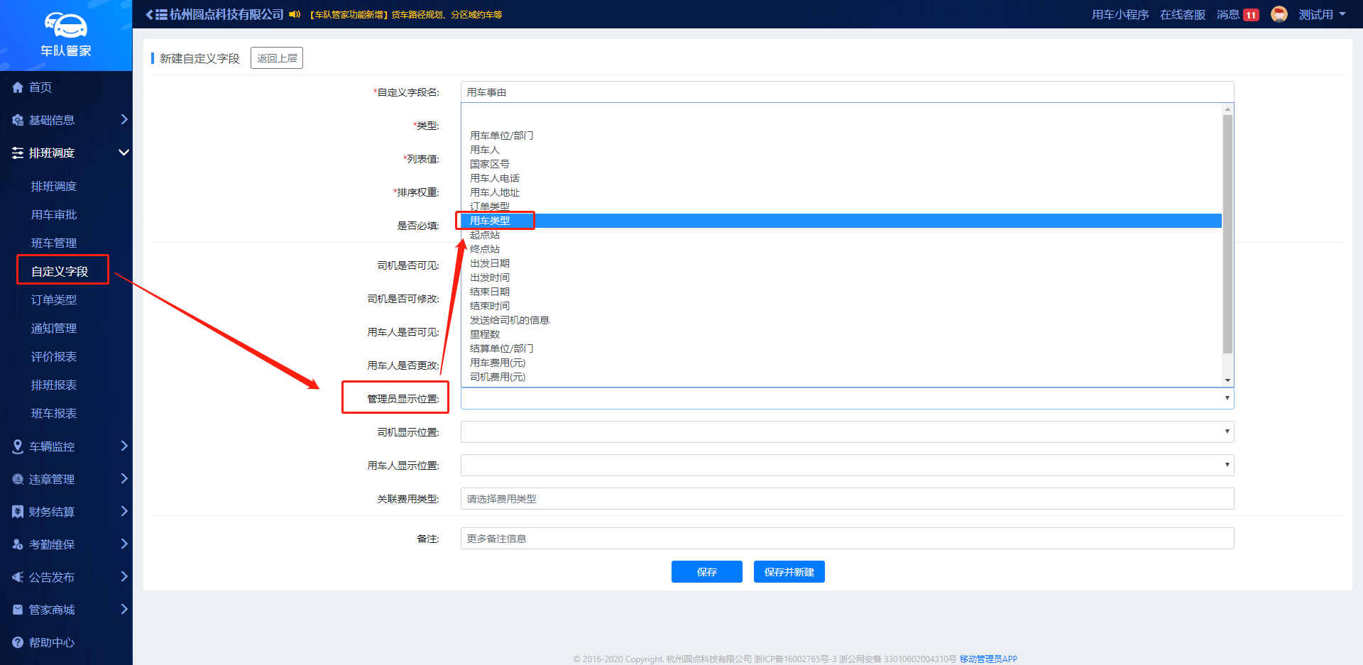 场景:管理员新增有关费用的字段名,并添加关联费用类型,排班任务完成后,系统将生成相关费用类型的账务费用记录。 路径:管理员网页端--排班调度--自定义字段--添加自定义字段--关联费用类型