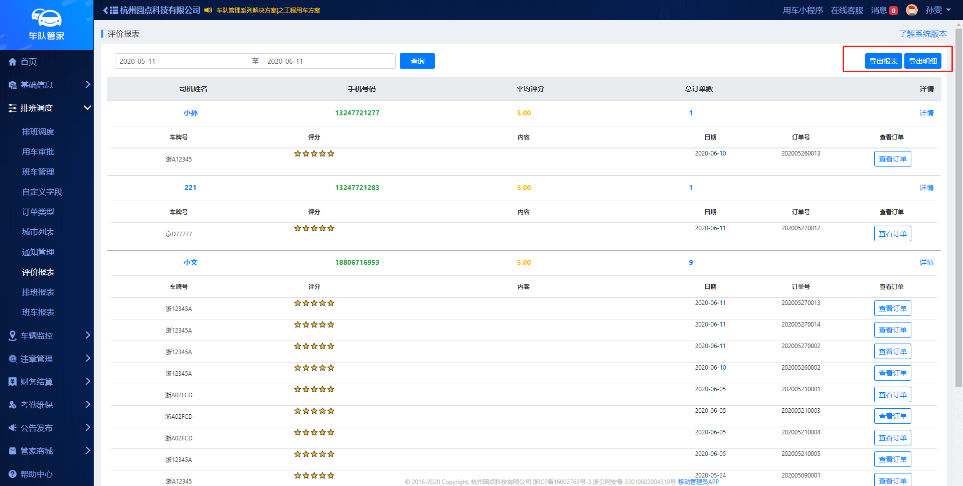场景:用车人在行程结束后提交针对司机的评价,系统将自动生成统计报表,管理员可导出报表明细作为司机服务水平的考评。 路径:管理员网页端--排班调度--评价报表--右上角“导出报表”