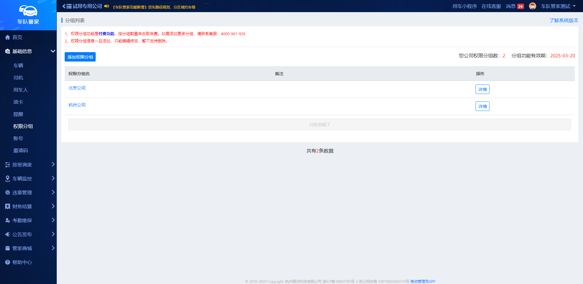 车队管家基于分组管理的形式,对权限分组、监控分组进行功能升级。例如管理员对部门或监控车辆进行分组归类,在目标分组内的用户对系统资源的处理拥有可查看或可支配的权限,实现更加方便的车队管理,减少人工成本,同时确保部门信息的安全性。