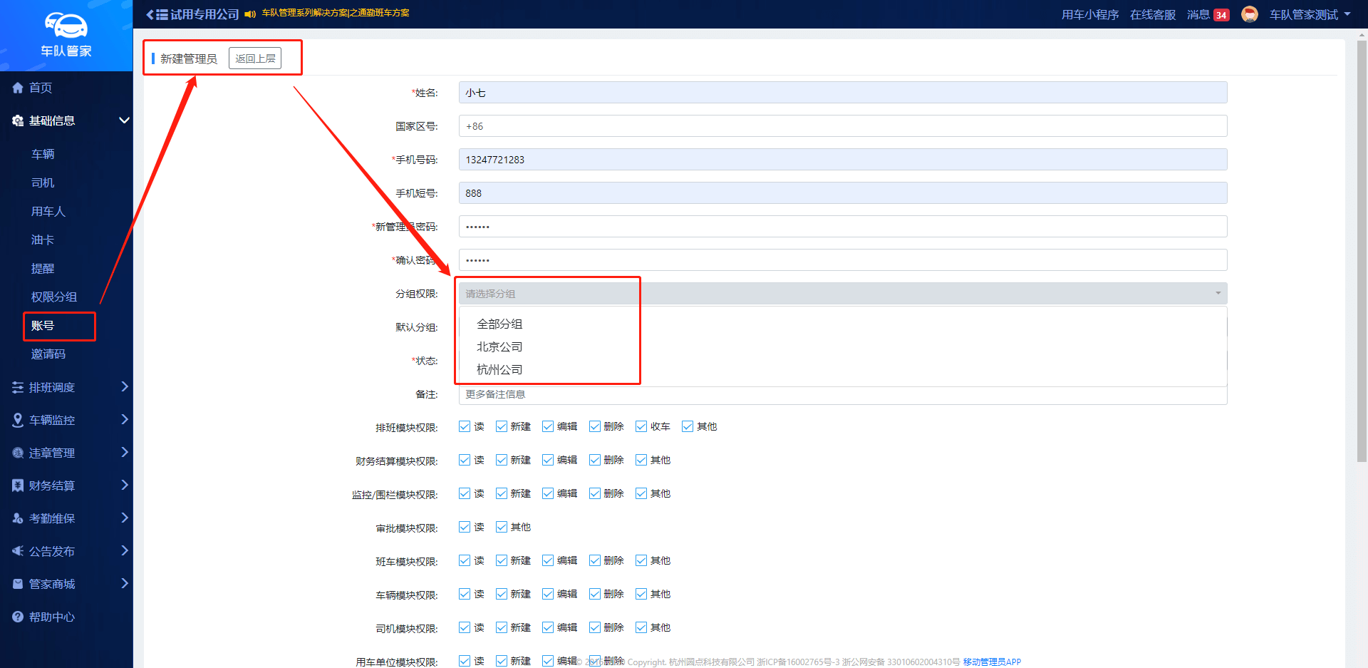 •分组创建完成后,管理员在根据用户权限不同进行角色分组,例如添加车辆、司机、用车人、账号、订单类型、城市列表的信息模块时,分配不同的权限,权限分类规定了用户在所在组的操作权限。