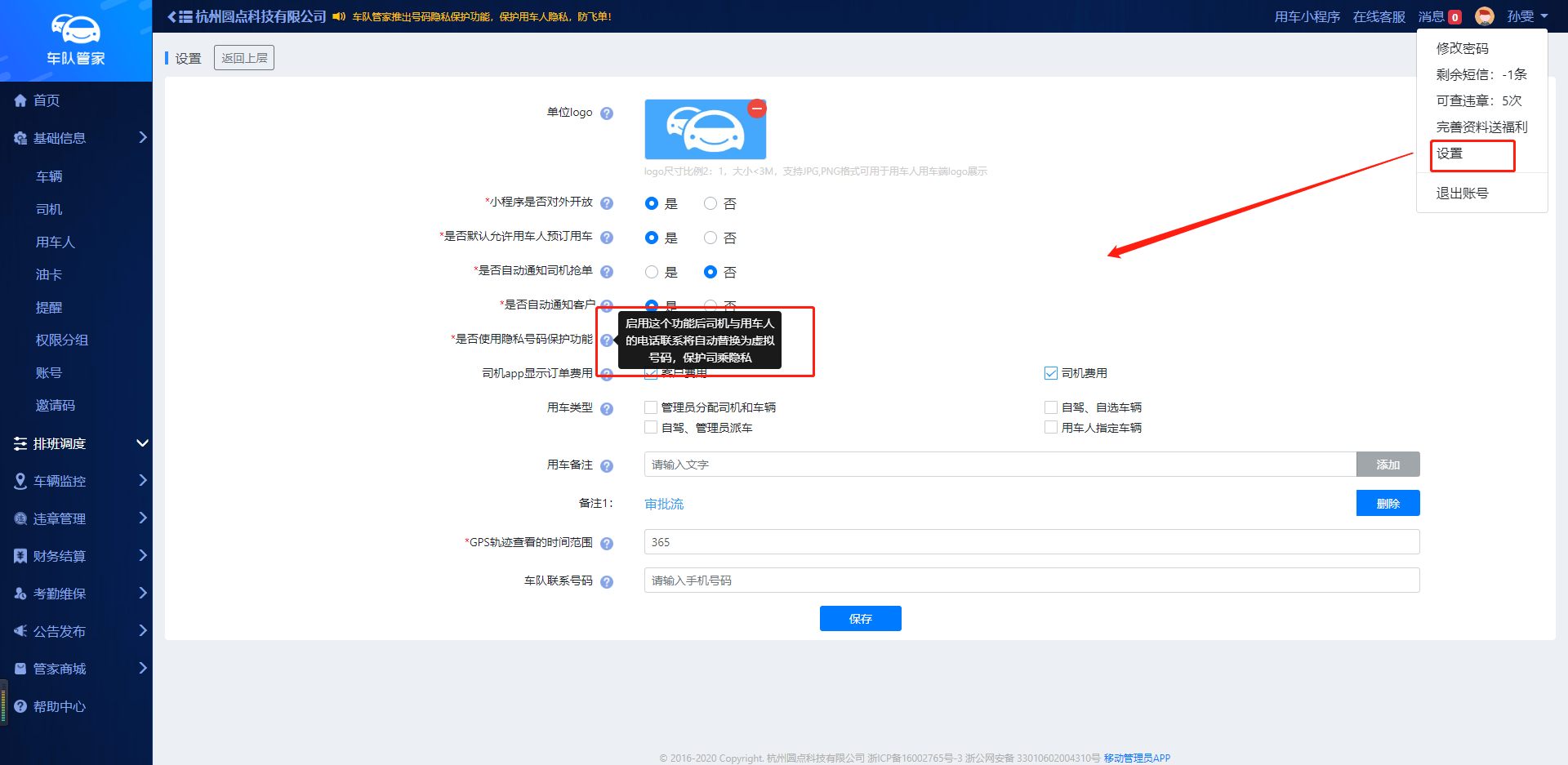 场景:管理员通过【设置】,自主配置小程序、隐私号码、GPS轨迹查看天数等功能。