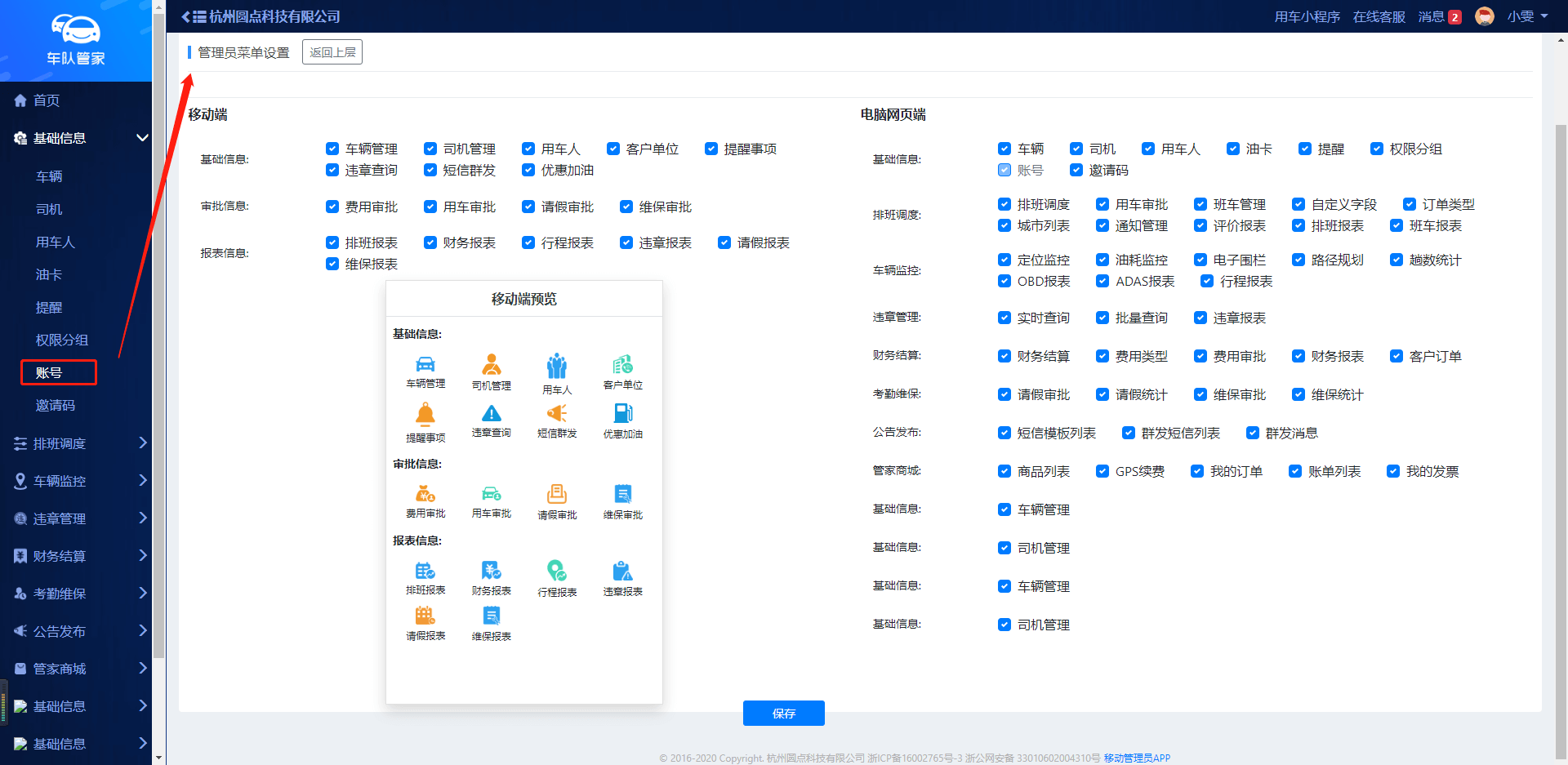 进入菜单功能列表页,自主勾选菜单。点击保存,网页端/APP端页面只显示勾选的菜单。