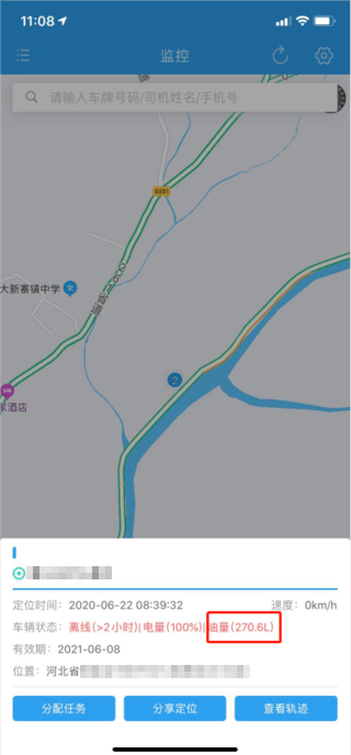 场景:车辆上若已安装超声波油耗设备,管理员可通过监控列表实时查看车辆的剩余油量。