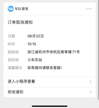 场景:用车人申请用车后,若订单被取消,微信后台将自动进行消息提醒。同时短信包用完时系统也会自动提醒管理员。