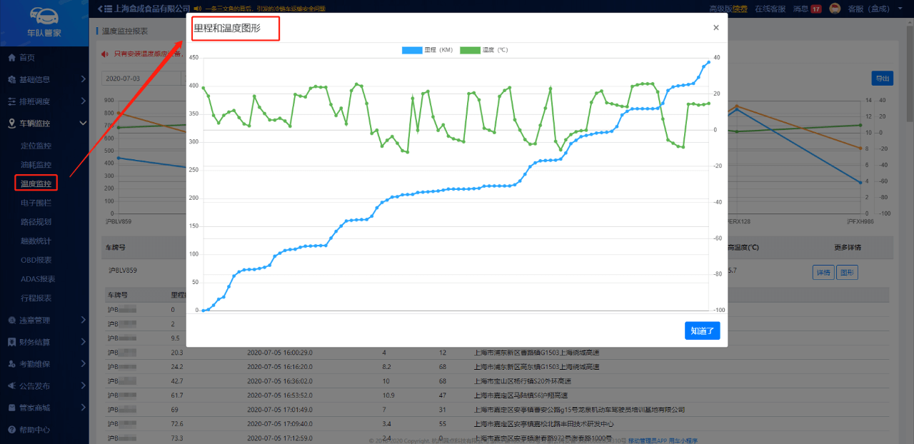 场景:管理员可通过后台图表形式,实时监测冷链车厢内部的温度变化,跟踪冷链过程变化。当车厢内部温度产生变化时,系统会判定异常事件,提醒管理员。