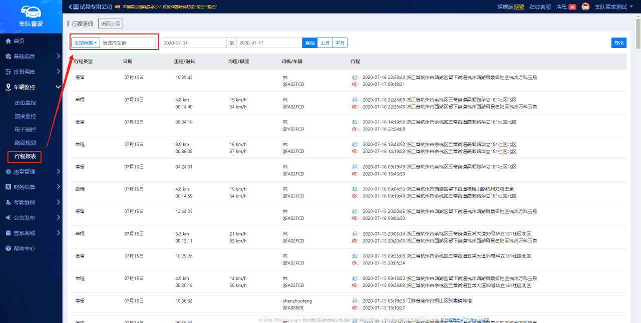 路径:管理员网页端--车辆监控--行程报表--行程明细