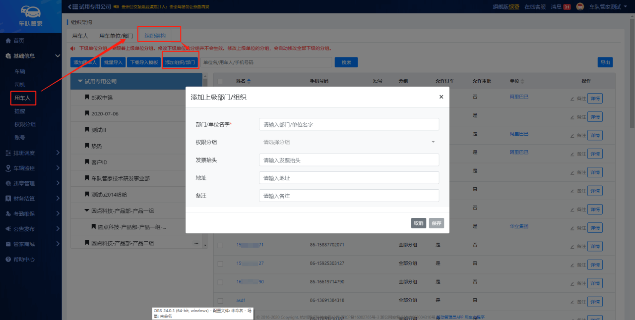路径:管理员网页端--基础信息--用车人--组织架构