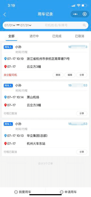 场景:用车人下单后,可直接在用车记录中选择对应的订单进行撤销/编辑操作。