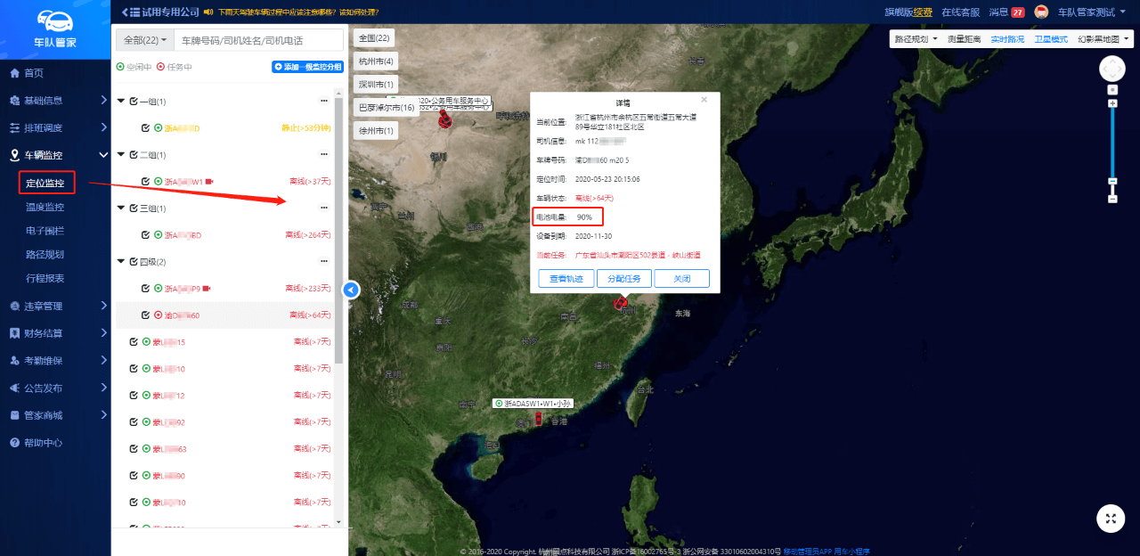 场景:为了优化数据展示效果,当定位设备的内置电池电量低于100%,详情页中会自动显示剩余电量。此时设备电路可能与车辆断连,管理员应及时查看。