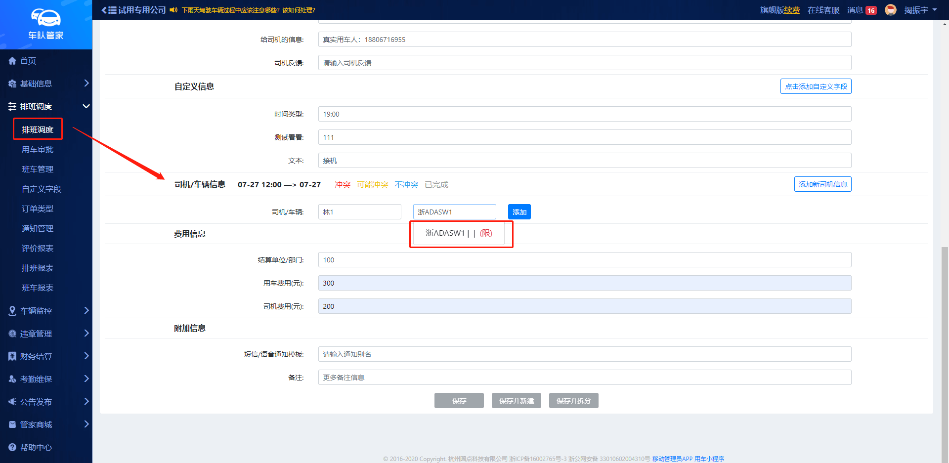 路径:管理员网页端--排班调度--添加排班--添加车辆和司机