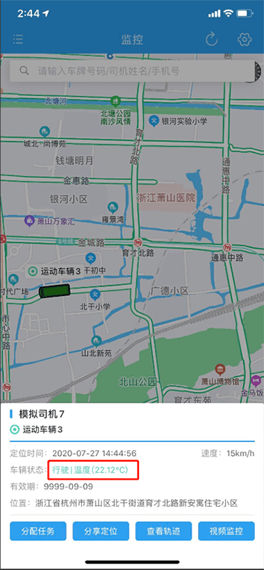 场景:若车辆已安装温度传感器,管理员可直接在定位监控列表中查看车厢内部的温度变化。