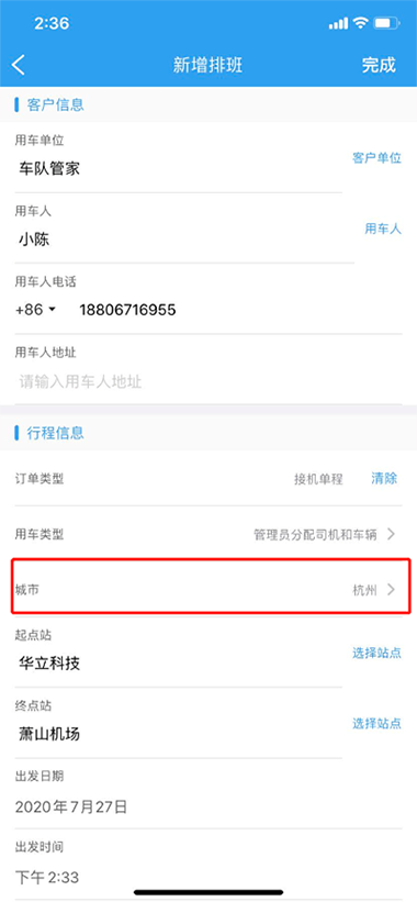 场景:如车队在多个区域都有业务,管理员在进行排班调度时,可选择指定的区域指派车辆,后期方便根据城市列表进行订单管理。