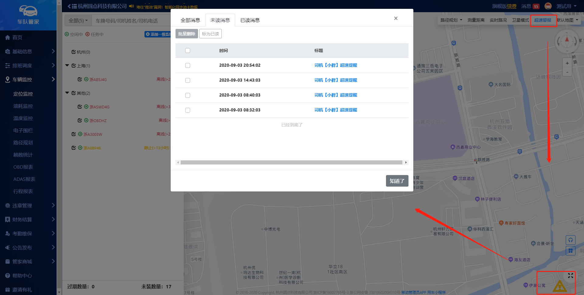 报警路径:管理员网页端--车辆监控--超速报警--点击右下角报警图标