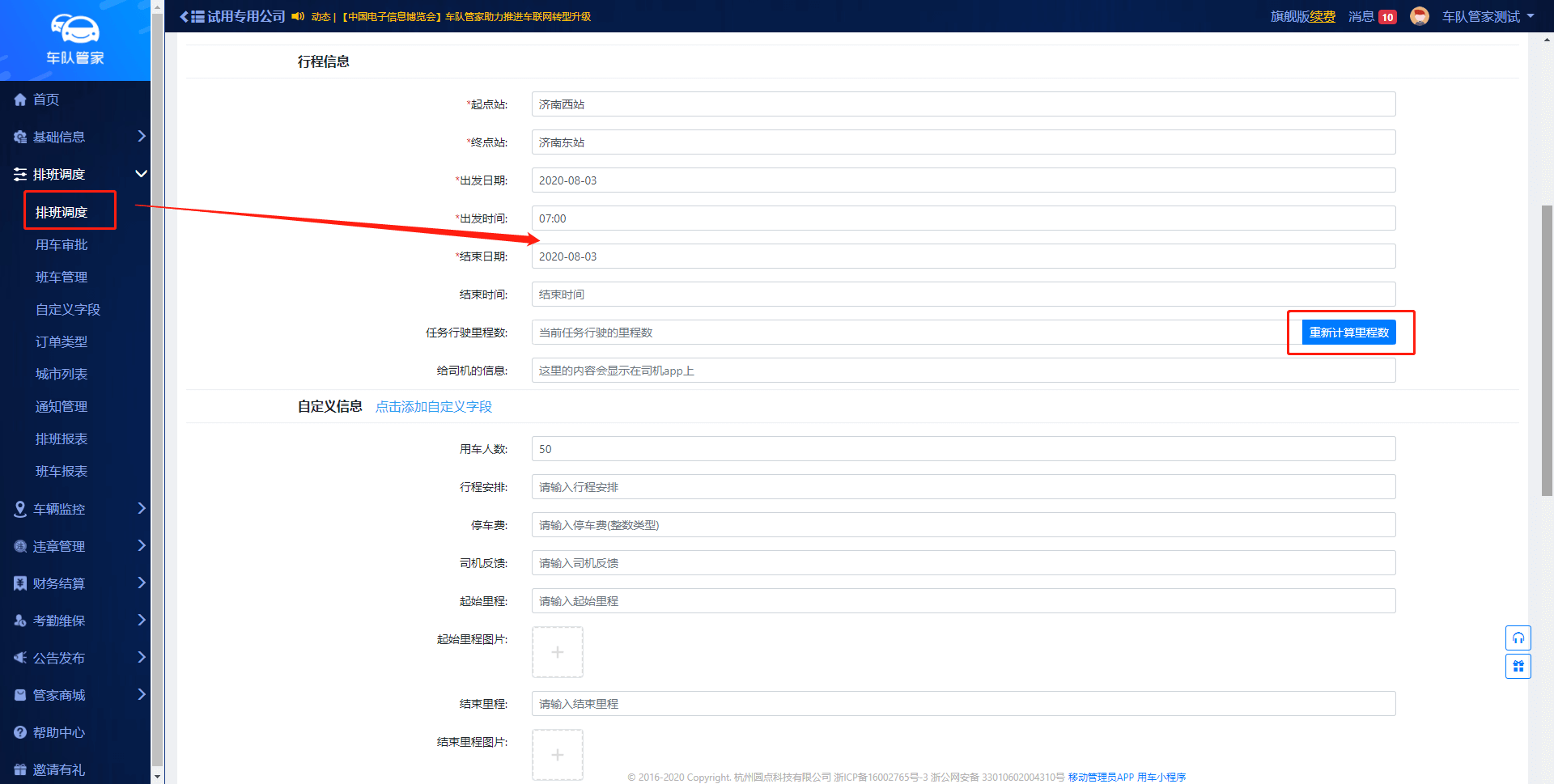 行车任务结束后,如管理员认为结束时间和里程有偏差,可进入收车更新页面,修改结束时间,点击“重新计算里程数”按钮,重新计算任务里程;或手工更改里程数。