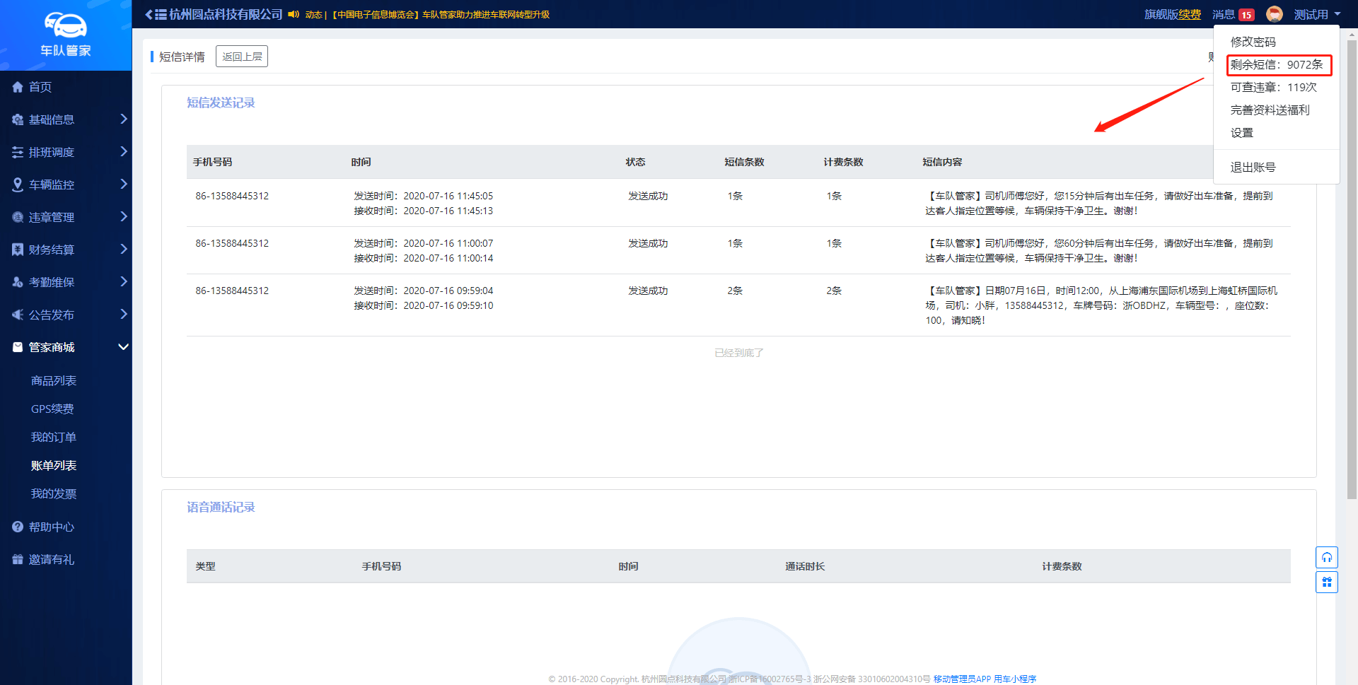 为详细了解短信语音消费情况,管理员可在车队管家后台进行详细查询。