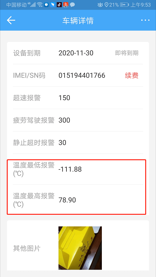 针对已安装温度传感器的冷链车辆,管理员也可在管理员APP端设置车辆温度过高/过低报警值,当冷藏车厢温度超过预设范围,系统将自动报警提醒管理员。 路径:管理员APP端--基础信息--车辆管理--右上角“+”