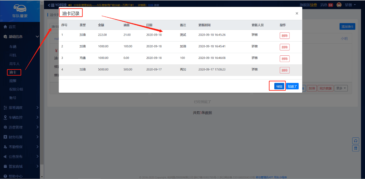 路径:管理员网页端--基础信息--油卡--导出