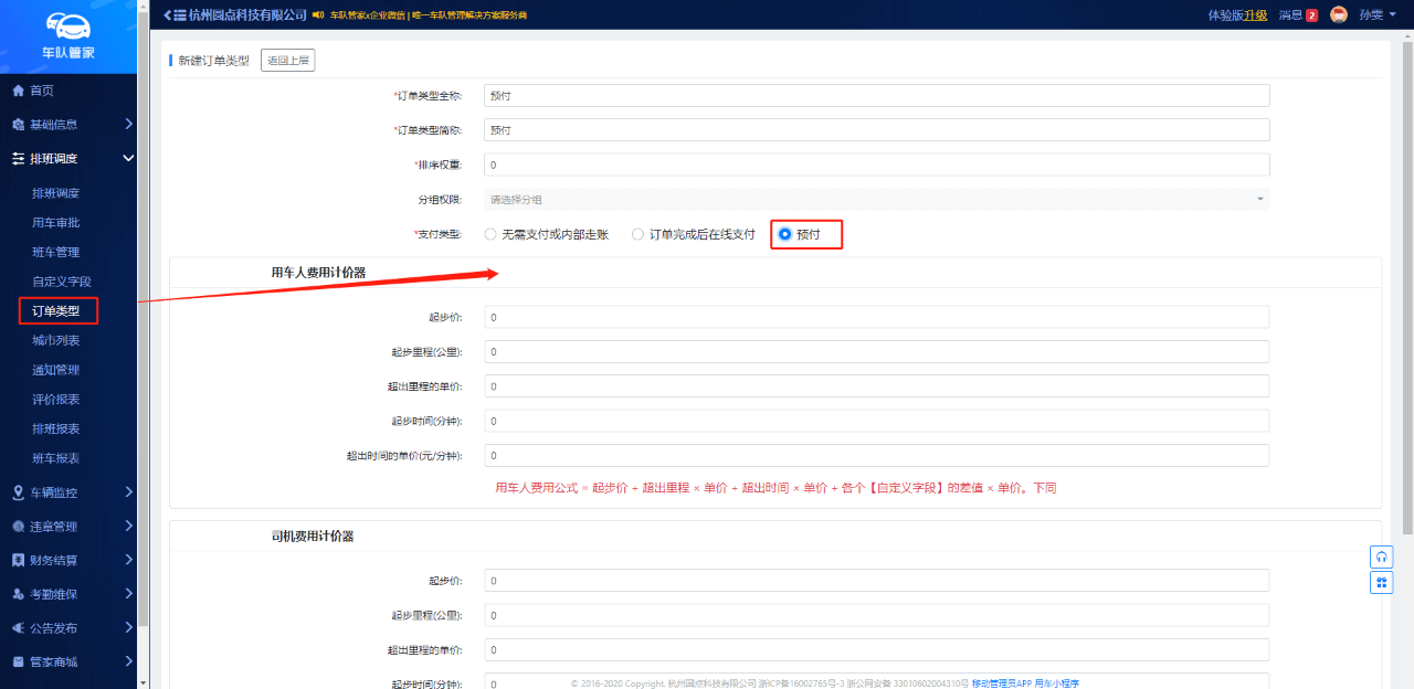 针对旅游客运车队,用车小程序支持在线预付,管理员在订单类型中添加预付功能,用车人在订单生成时完成预付的操作即可。 添加预付功能:管理员网页端--排班调度--订单类型--添加订单类型