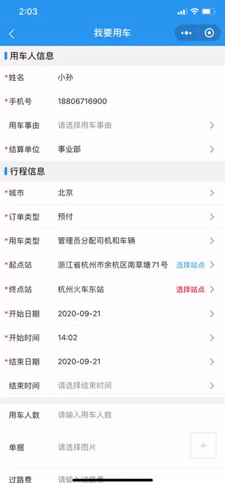 完成预付操作:用车小程序端--我要用车--订单类型