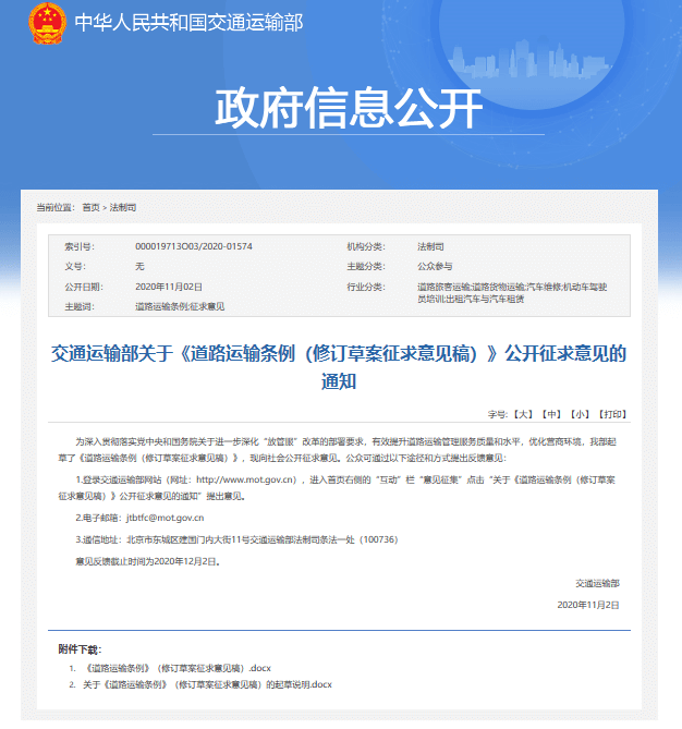 近日,交通运输部起草了《道路运输条例(修订草案征求意见稿)》,即日起面向社会公开征求意见。
