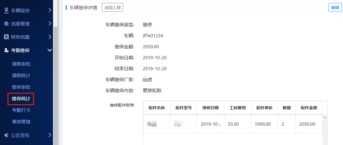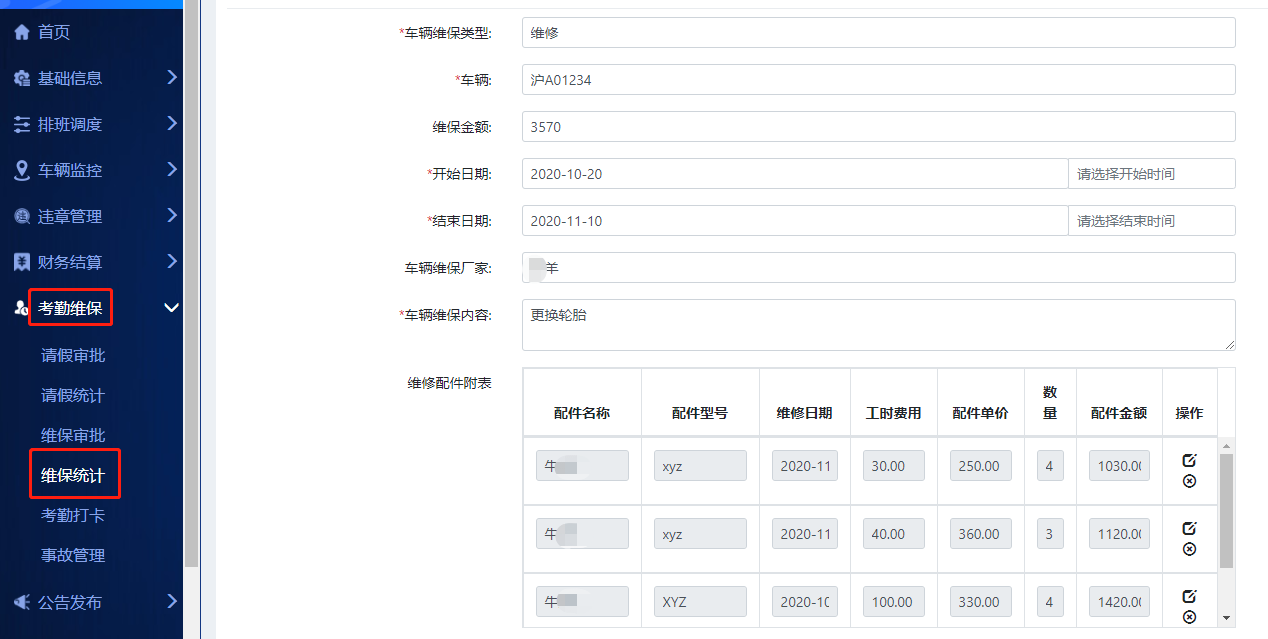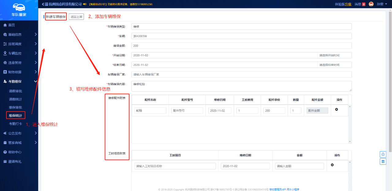 路径:管理员网页端--考勤维保--维保统计--添加车辆维保