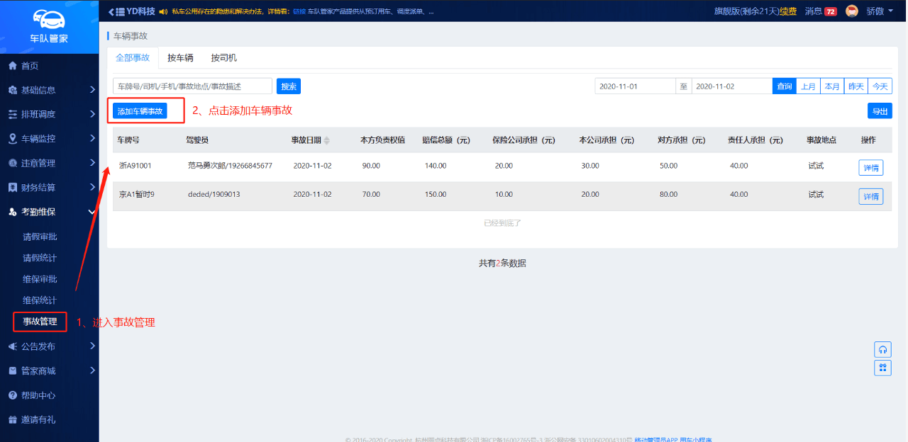路径:管理员网页端--考勤维保--事故管理--添加车辆事故