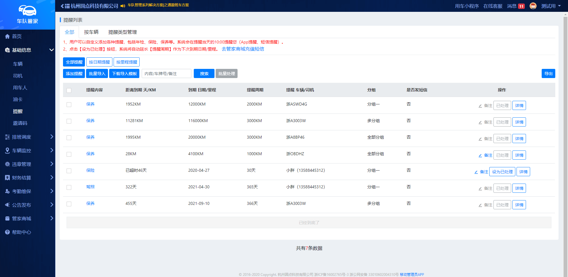 为避免食品易受到外界感染源的污染,管理员可通过车队管家后台进行司机定期体检提醒,以及车辆定期的新冠病毒监测和全面杀毒智能提醒等,后台一键通知。