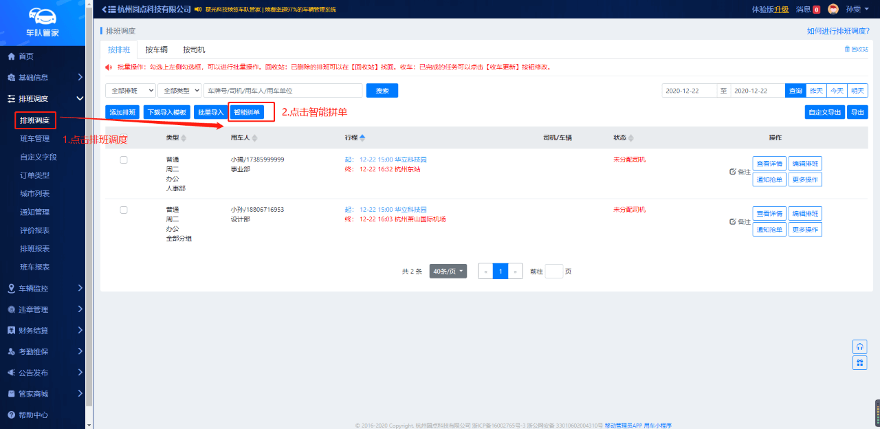 管理员进入“排班调度”页面,点击“智能拼单”,在“智能拼单”页面中,管理员可勾选全部选项,系统会根据智能调度设置自动对未安排车辆/司机的订单进行合理拼单。(如下图):