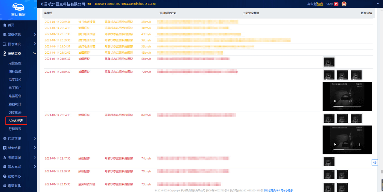 车队管家利用ADAS设备实时监测驾驶司机的行为状态,同时系统对司机疲劳驾驶、打电话、抽烟等不良行为进行图表分析,包括当前报警时间、地点,违规驾驶图片及视频等。