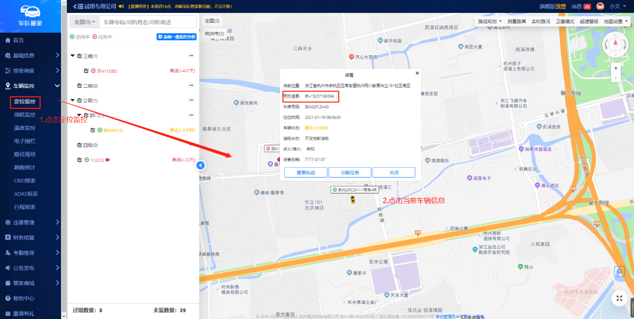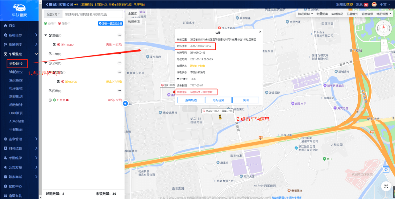 管理员可通过定位监控页面查看车辆详情,比如车辆正在执行任务则显示当前任务中的司机信息及任务状态,若车辆没有任务则显示默认绑定司机。