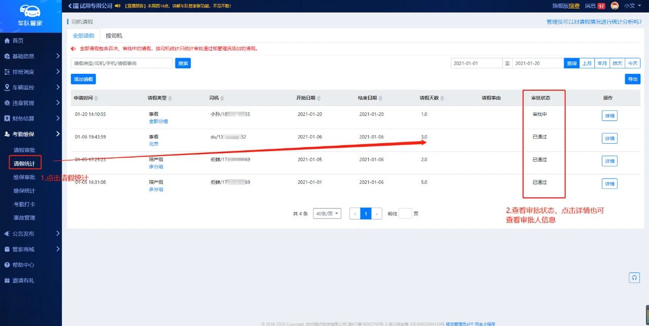 请假统计路径:管理员网页端--考勤维保--请假统计--详情